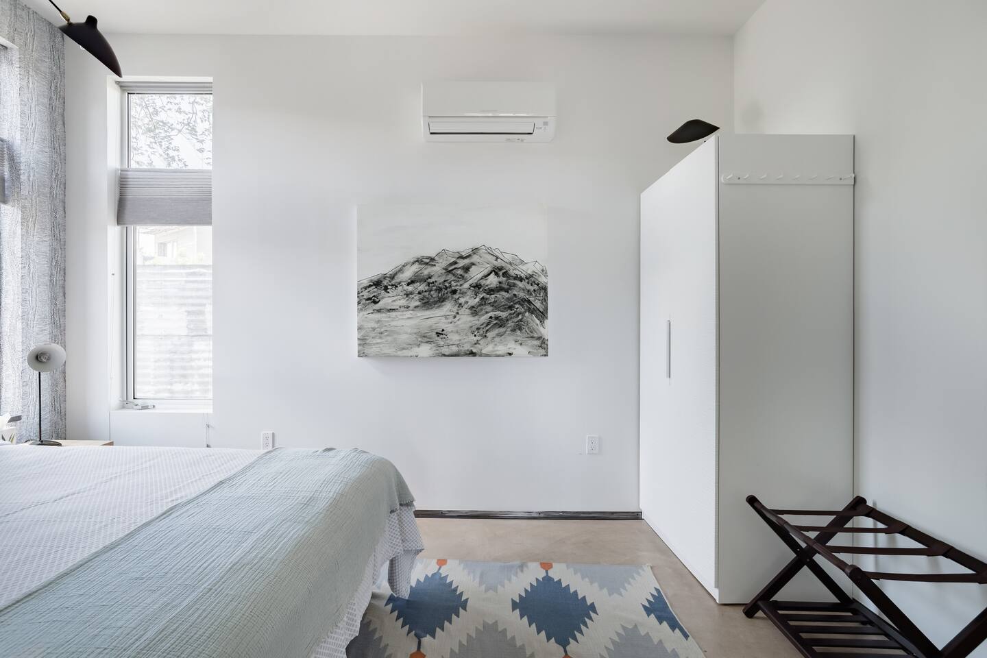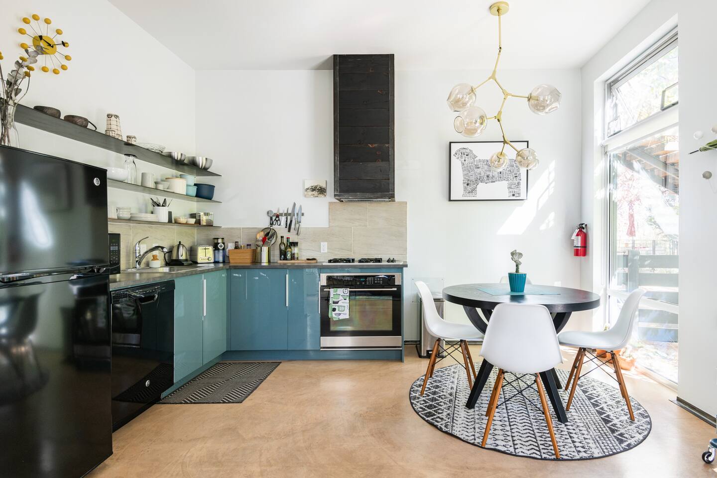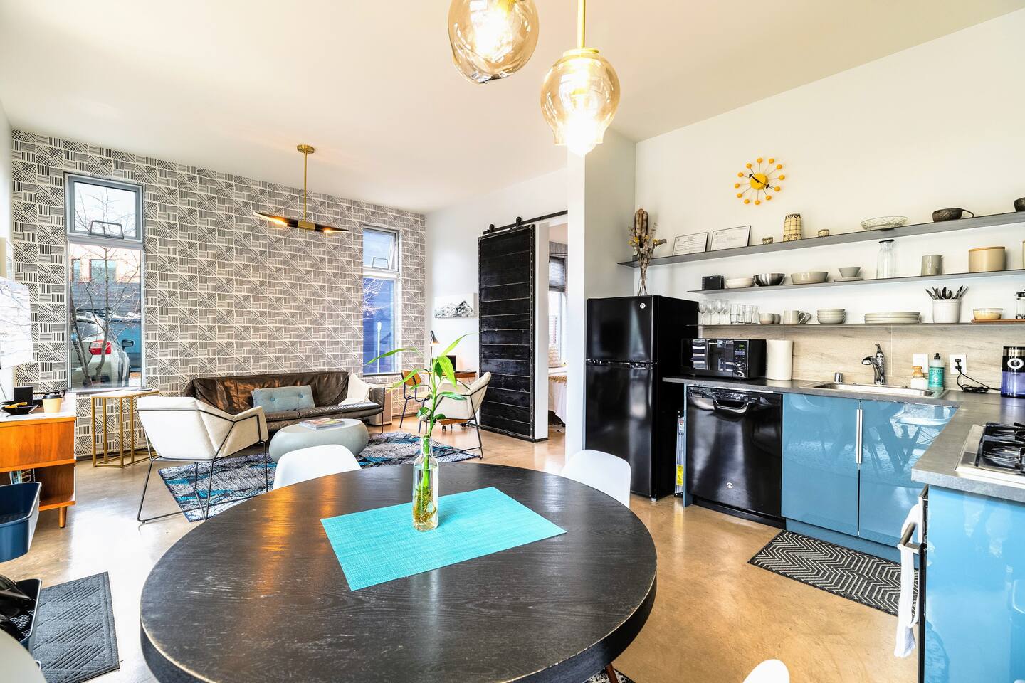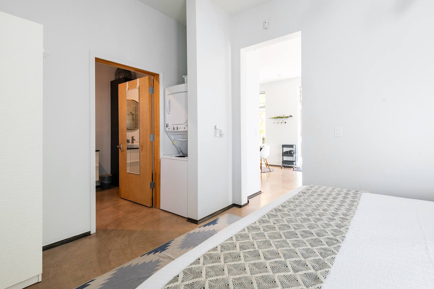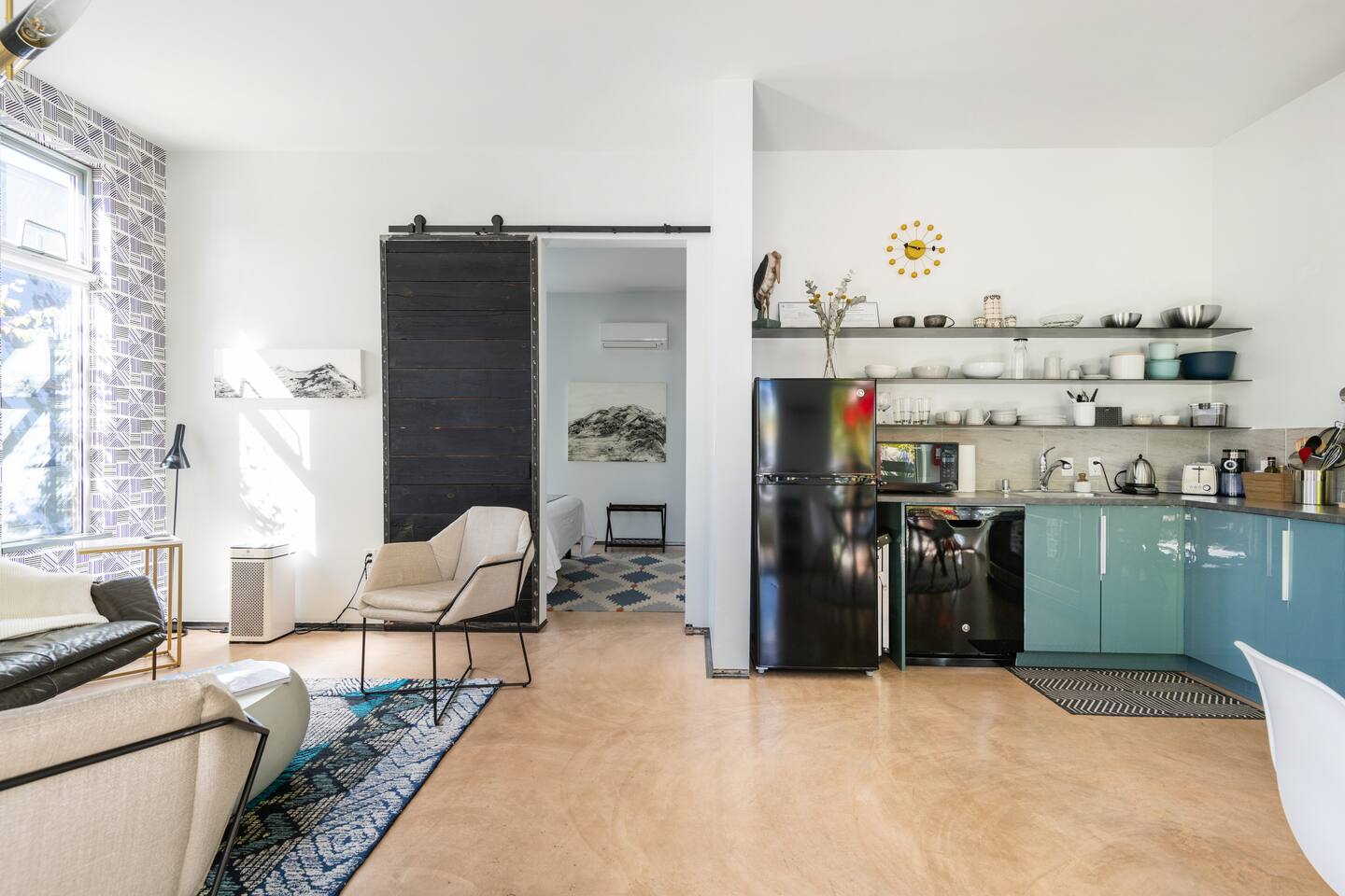 Luxury designer ground-floor apartment in Santa Fe's Baca Railyard District. Fully equipped chef's kitchen with dining for 4, dishwasher, laundry. private patio, steps from Cafecito (coffee shop), central to Meow Wolf, Railyard Park, and the Plaza. + Full Kitchen + Dishwasher + Washer/Dryer + Comfy King Bed + A/C & Radiant Heat Easy downtown access via scenic trail. High-speed internet. King bed with lux sheets. Whole Foods & Trader Joe's nearby. Additional units available.