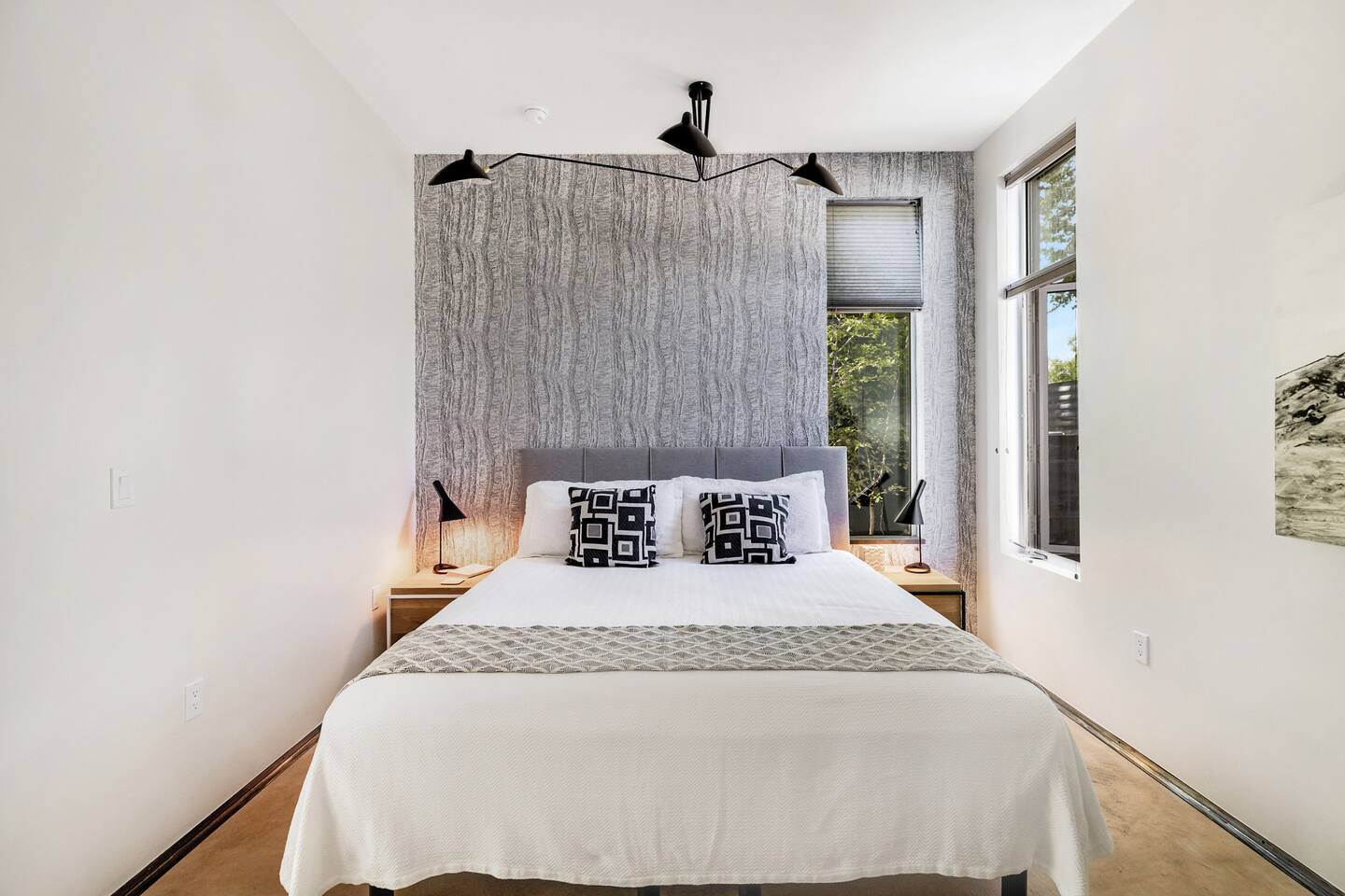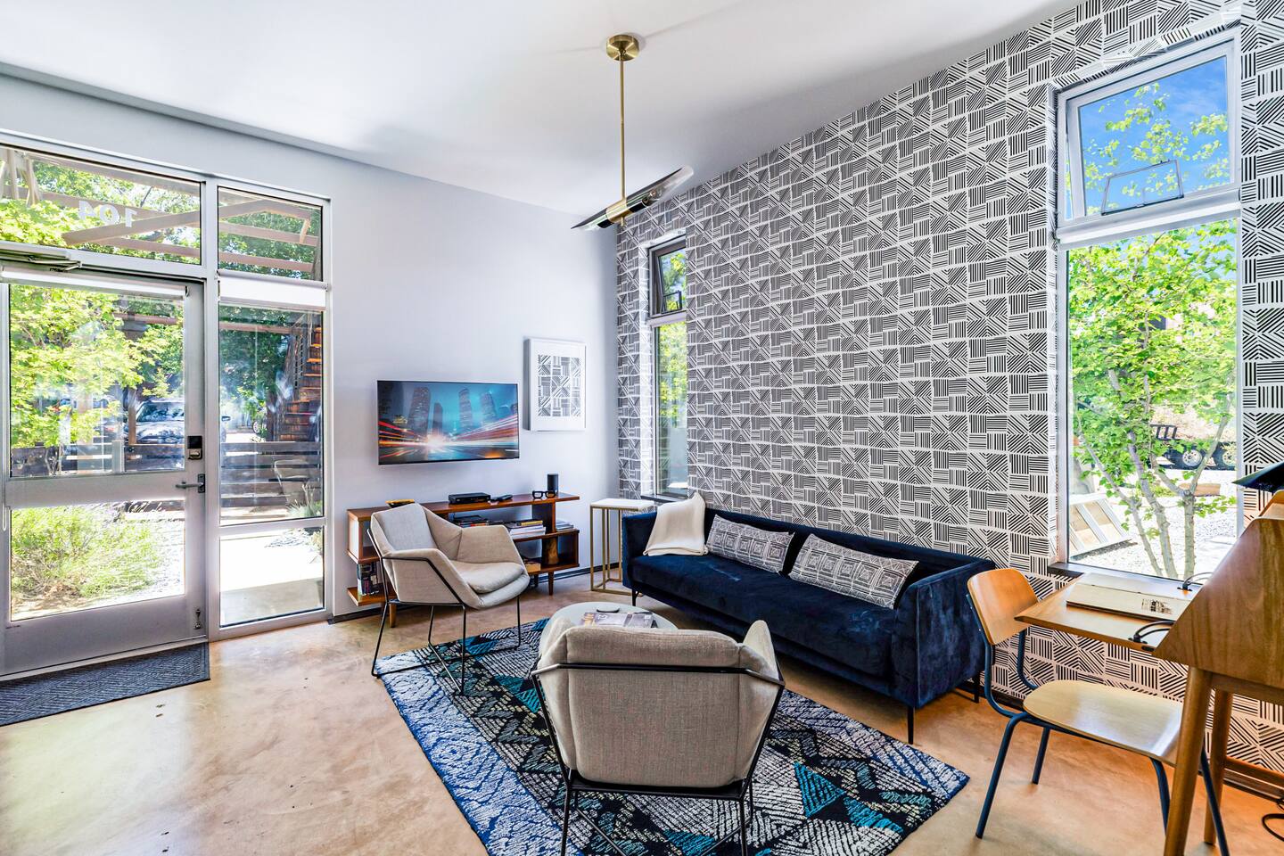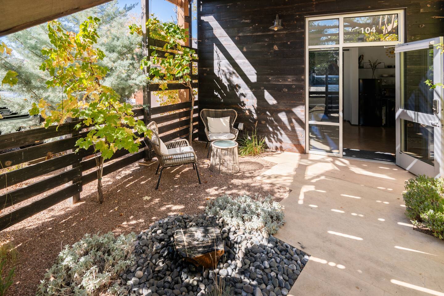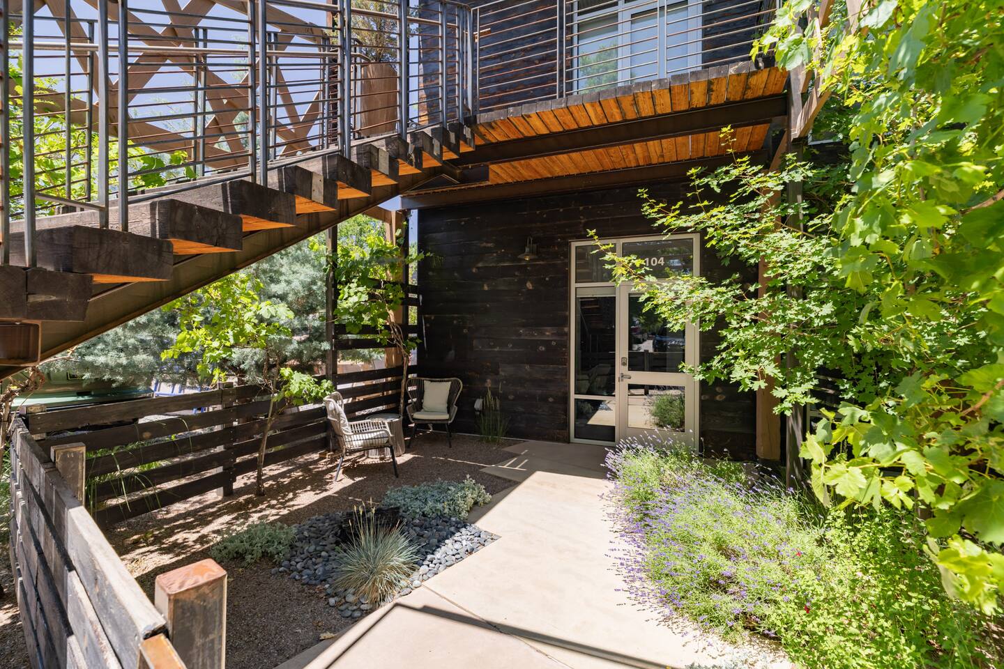 Escape to this bright, modern, and accessible ground-floor apartment in the heart of Santa Fe's vibrant Railyard District! Located in The Trailhead, a thoughtfully repurposed industrial building, this stylish unit offers a private, professionally landscaped terrace with outdoor seating. Enjoy easy access to the popular Cafecito coffee house and restaurant, just steps away. Enter through your private terrace with its own water feature into the light-filled living area, featuring a comfortable sofa, additional seating, and a smart TV. The full kitchen is equipped with an oven, four-burner range, dishwasher, and range hood – perfect for preparing meals. A dining table for four provides a comfortable space for dining, working, or gathering. Step through a sliding door to the serene bedroom, complete with a king-size bed and luxurious linens. The full bathroom features a shower/tub combo and ample counter space. A full-size washer/dryer adds convenience to your stay. Radiant heat warms your feet in winter, while air conditioning keeps you cool in summer. A Tesla Destination Charger and 220 port are available for EV Charging.