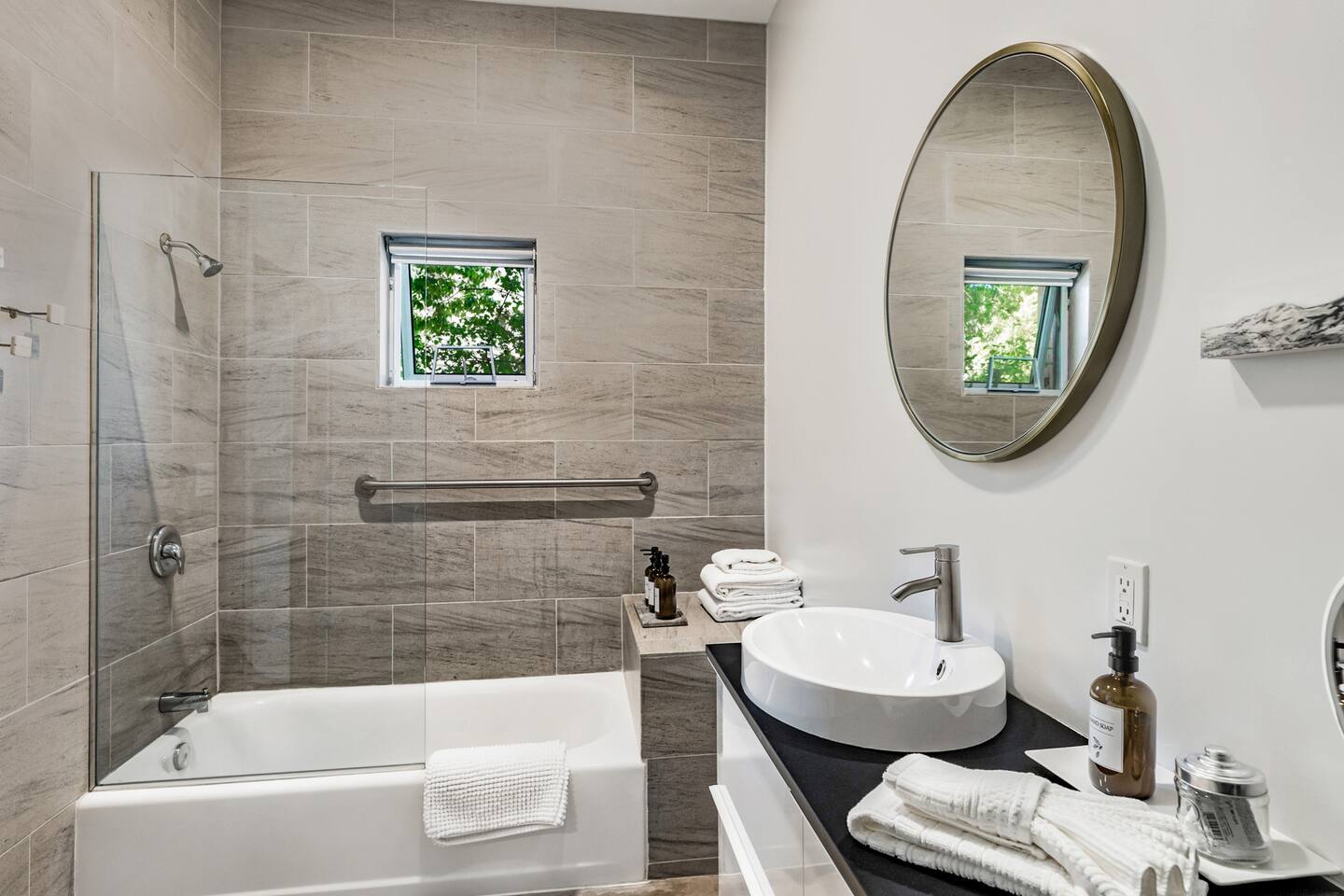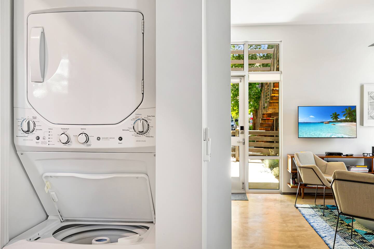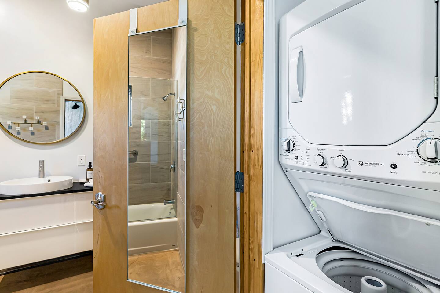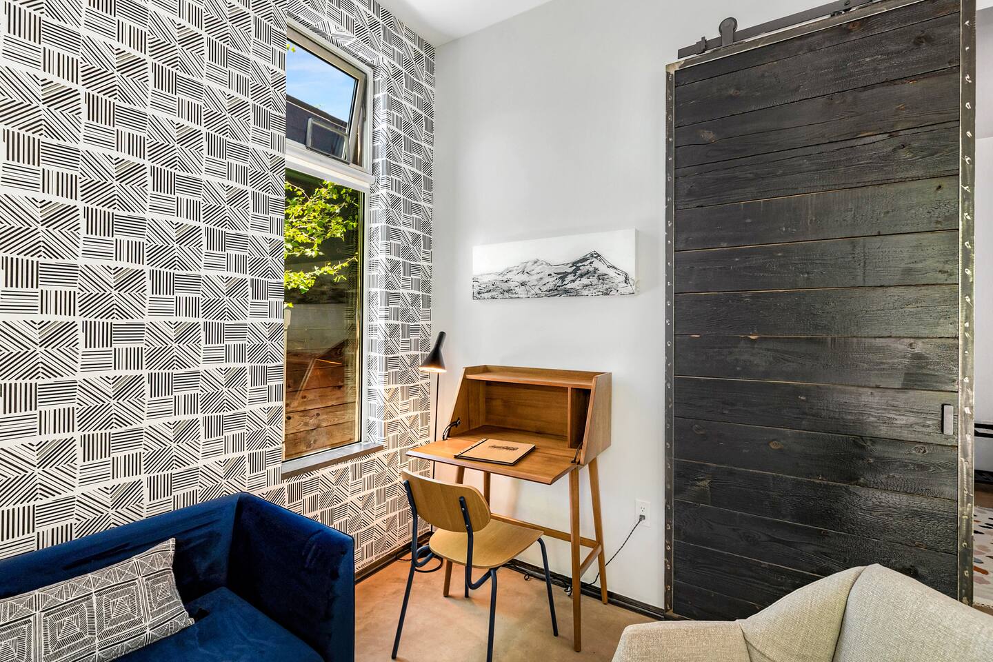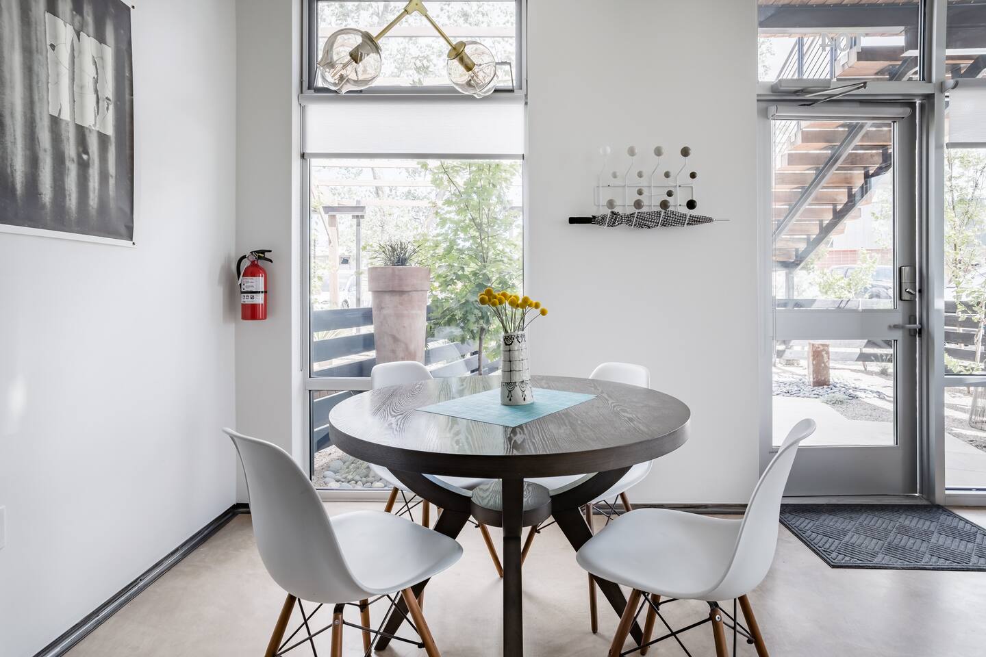 Escape to this bright, modern, and accessible ground-floor apartment in the heart of Santa Fe's vibrant Railyard District! Located in The Trailhead, a thoughtfully repurposed industrial building, this stylish unit offers a private, professionally landscaped terrace with outdoor seating. Enjoy easy access to the popular Cafecito coffee house and restaurant, just steps away. Enter through your private terrace with its own water feature into the light-filled living area, featuring a comfortable sofa, additional seating, and a smart TV. The full kitchen is equipped with an oven, four-burner range, dishwasher, and range hood – perfect for preparing meals. A dining table for four provides a comfortable space for dining, working, or gathering. Step through a sliding door to the serene bedroom, complete with a king-size bed and luxurious linens. The full bathroom features a shower/tub combo and ample counter space. A full-size washer/dryer adds convenience to your stay. Radiant heat warms your feet in winter, while air conditioning keeps you cool in summer. A Tesla Destination Charger and 220 port are available for EV Charging.
