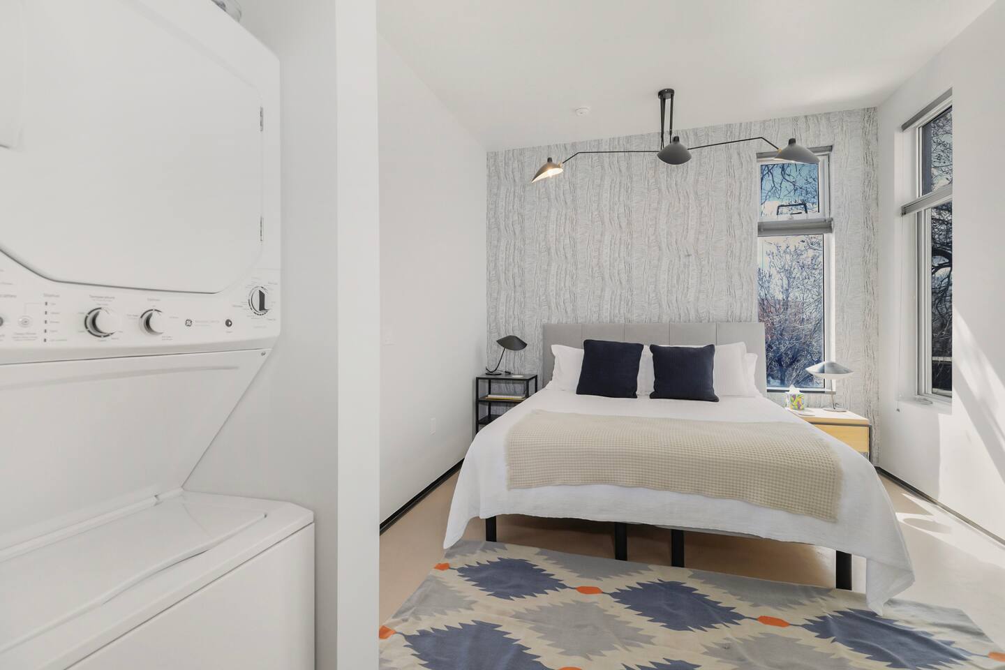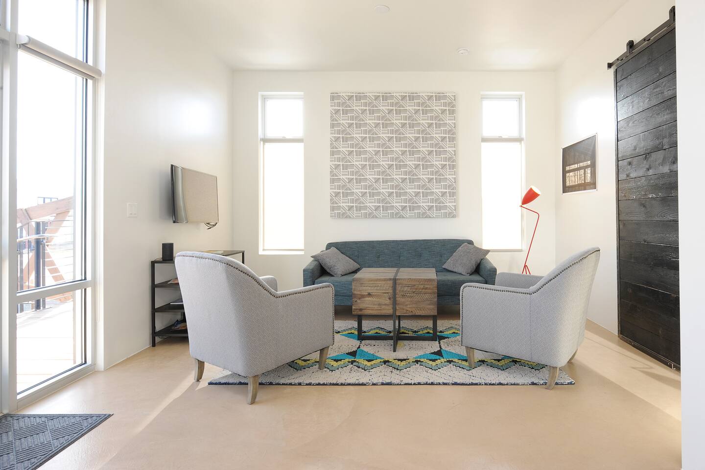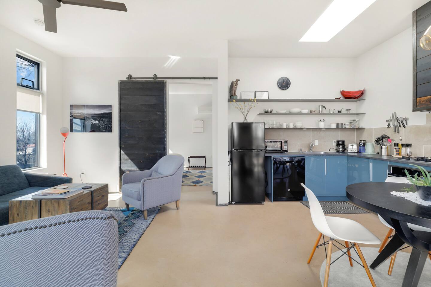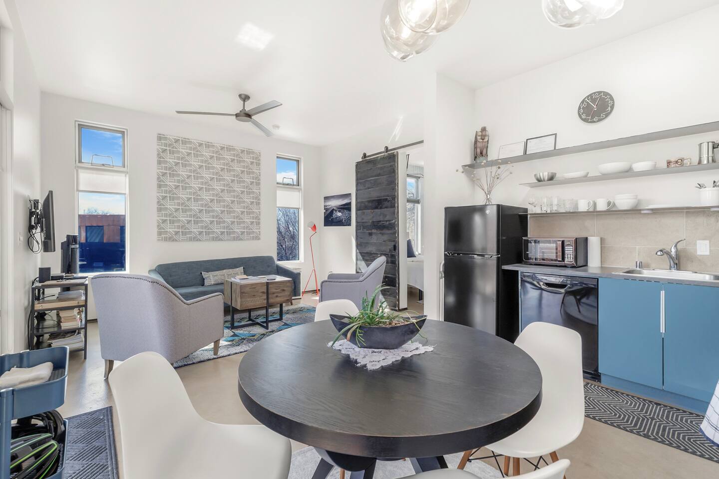Experience Santa Fe living at its finest in this stylish, fully equipped, and modern 2nd-floor apartment located in the heart of the vibrant Baca Railyard. This light-filled space offers the perfect blend of comfort, convenience, and privacy, making it an ideal retreat for couples, solo travelers, or small families. Step inside and be greeted by a clean, contemporary design bathed in natural light. The apartment boasts a fully equipped cook's kitchen, ready for you to whip up anything from a quick breakfast to a gourmet meal. Enjoy the comfort of radiant floor heating in the cooler months and refreshing air conditioning during the warmer ones. Start your day with a cup of coffee on your private balcony, taking in the breathtaking mountain views. The super comfortable bed promises a restful night's sleep, and a bonus pull-out sofa provides additional sleeping space for guests. Stay connected with high-speed internet available throughout the apartment, perfect for working remotely. A dedicated dining area for four offers a versatile space for sharing meals, holding small meetings, or catching up on work. For entertainment, enjoy access to Netflix, Amazon Echo, and Spotify, all conveniently set up on the smart TV and Echo device. You'll have complete privacy during your stay, allowing you to relax and unwind at your leisure. Despite your privacy, the vibrant Baca Railyard offers a dynamic atmosphere just steps from your door. Our beloved "Cafecito" restaurant is just steps away, and you'll find yourself within easy reach of downtown, the historic Plaza, world-class museums, hospitals, and all of Santa Fe's extraordinary restaurants. For larger groups, an additional unit is available for rent below, providing flexible accommodation options. Whether you're exploring the city's rich history and culture, indulging in its culinary delights, or simply seeking a peaceful getaway, this Santa Fe apartment is the perfect home base for your adventure. A Tesla Destination Charger and 220 port are available for free EV Charging.