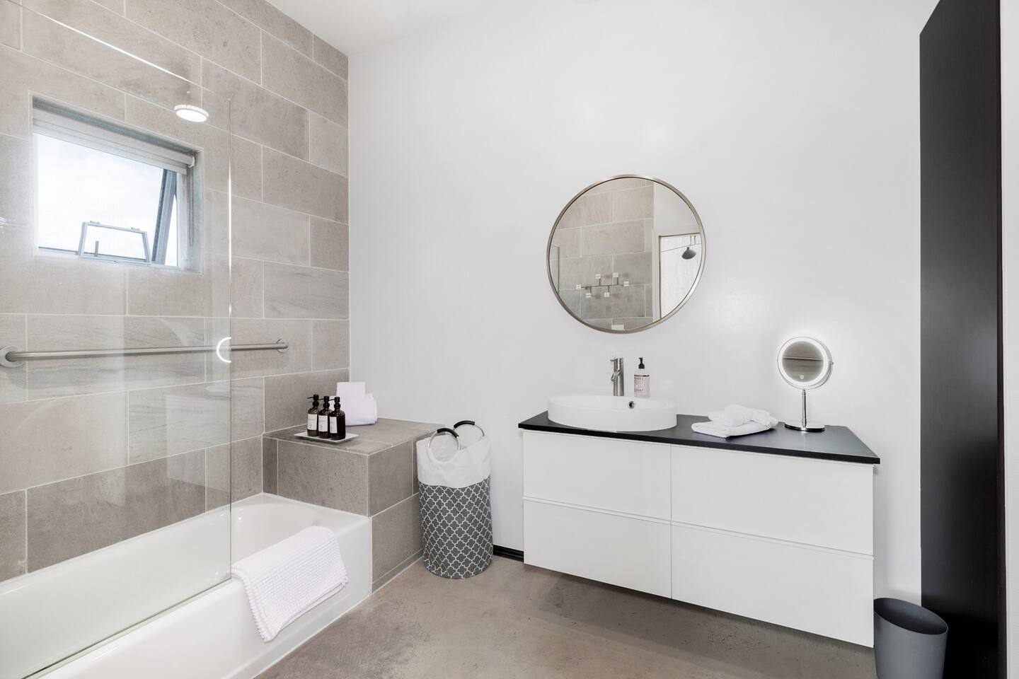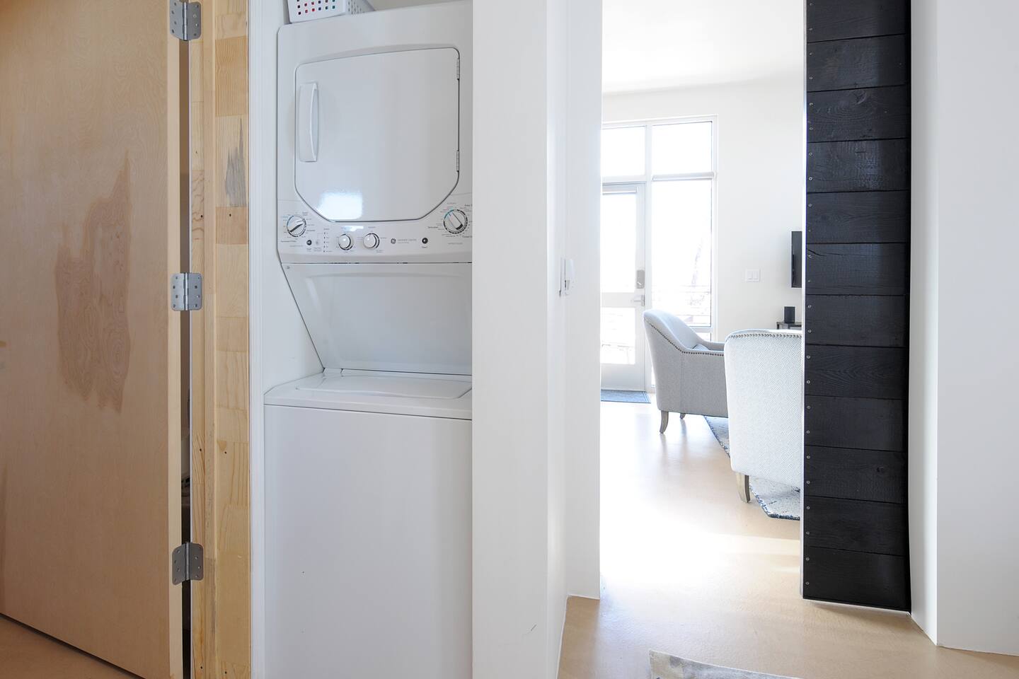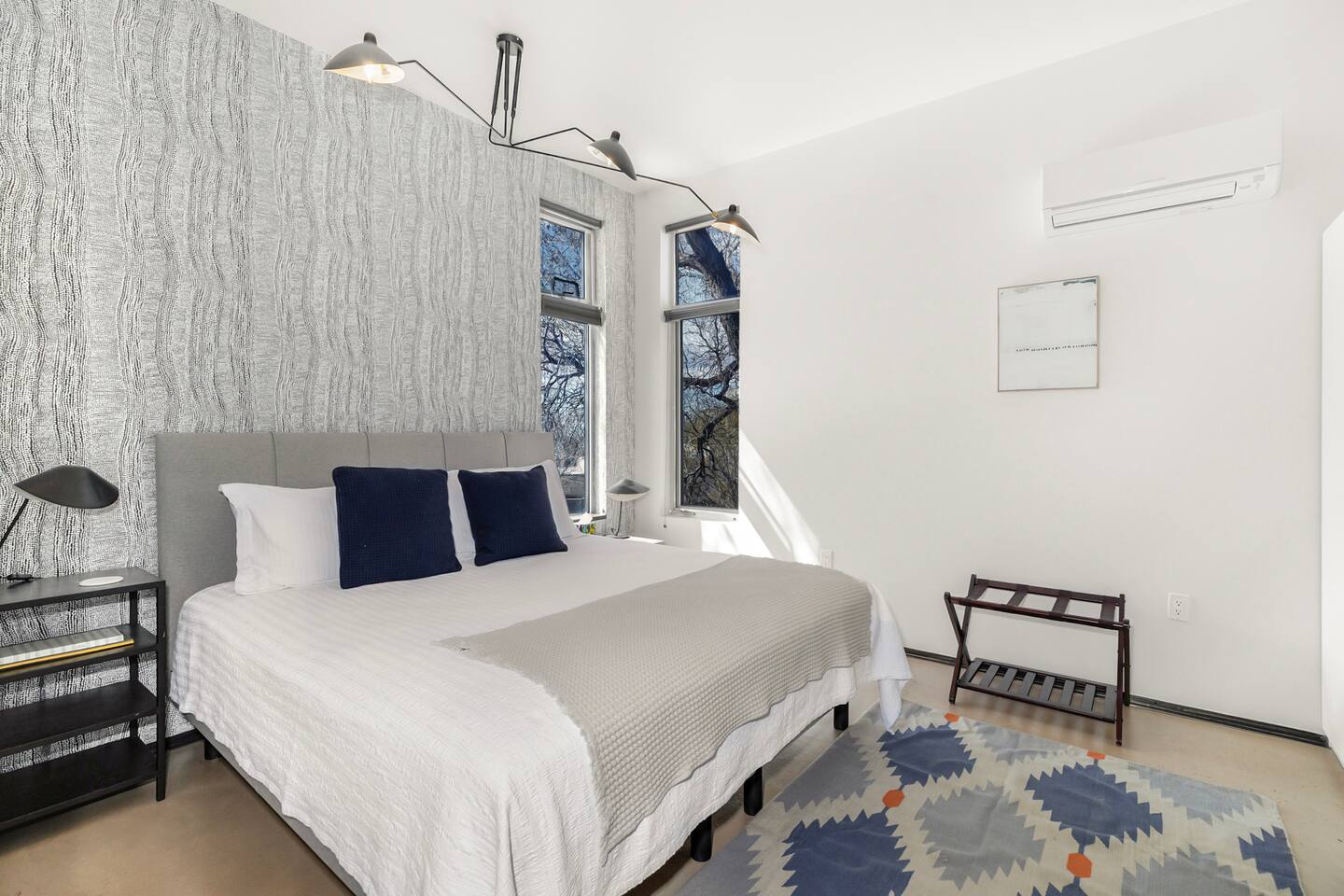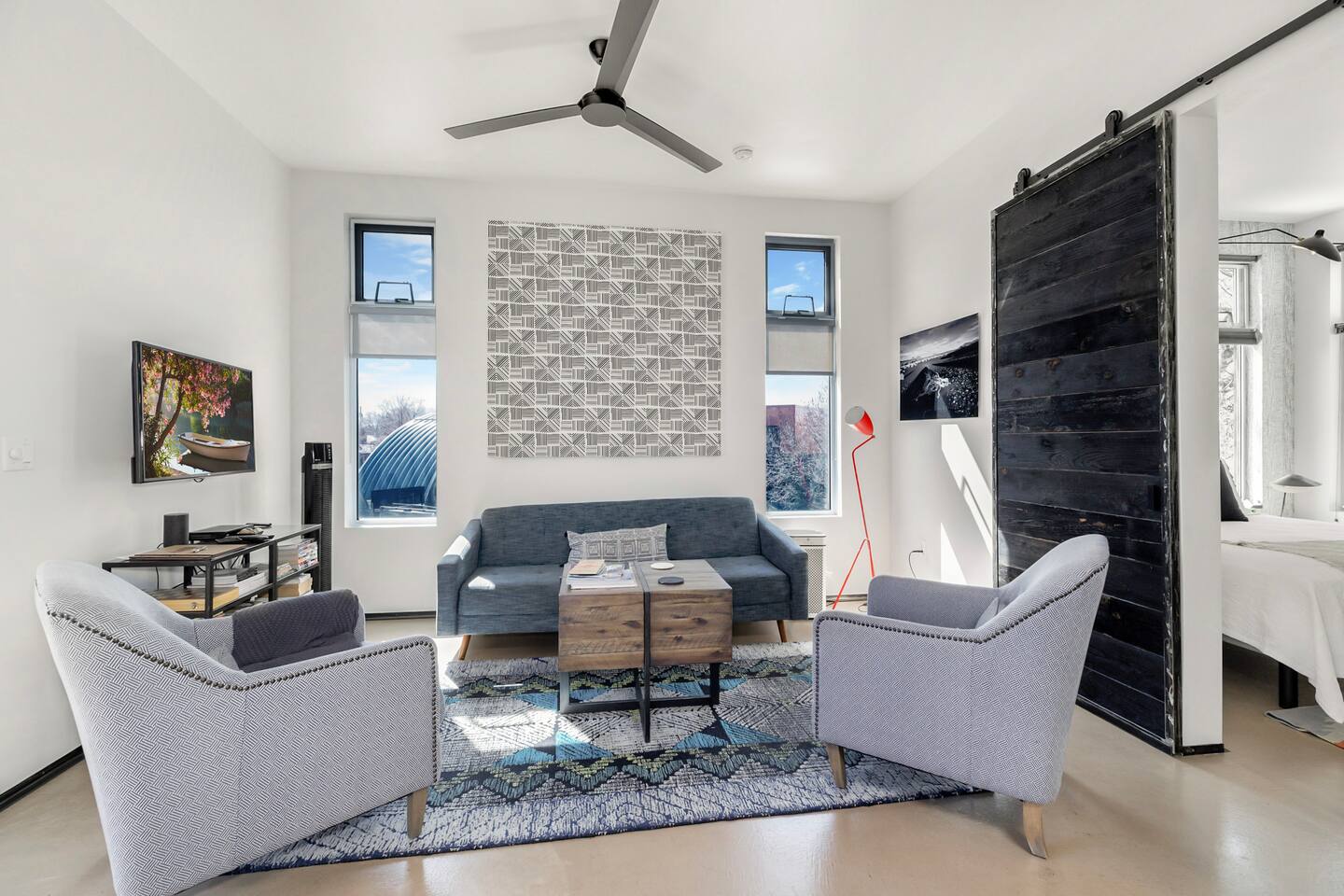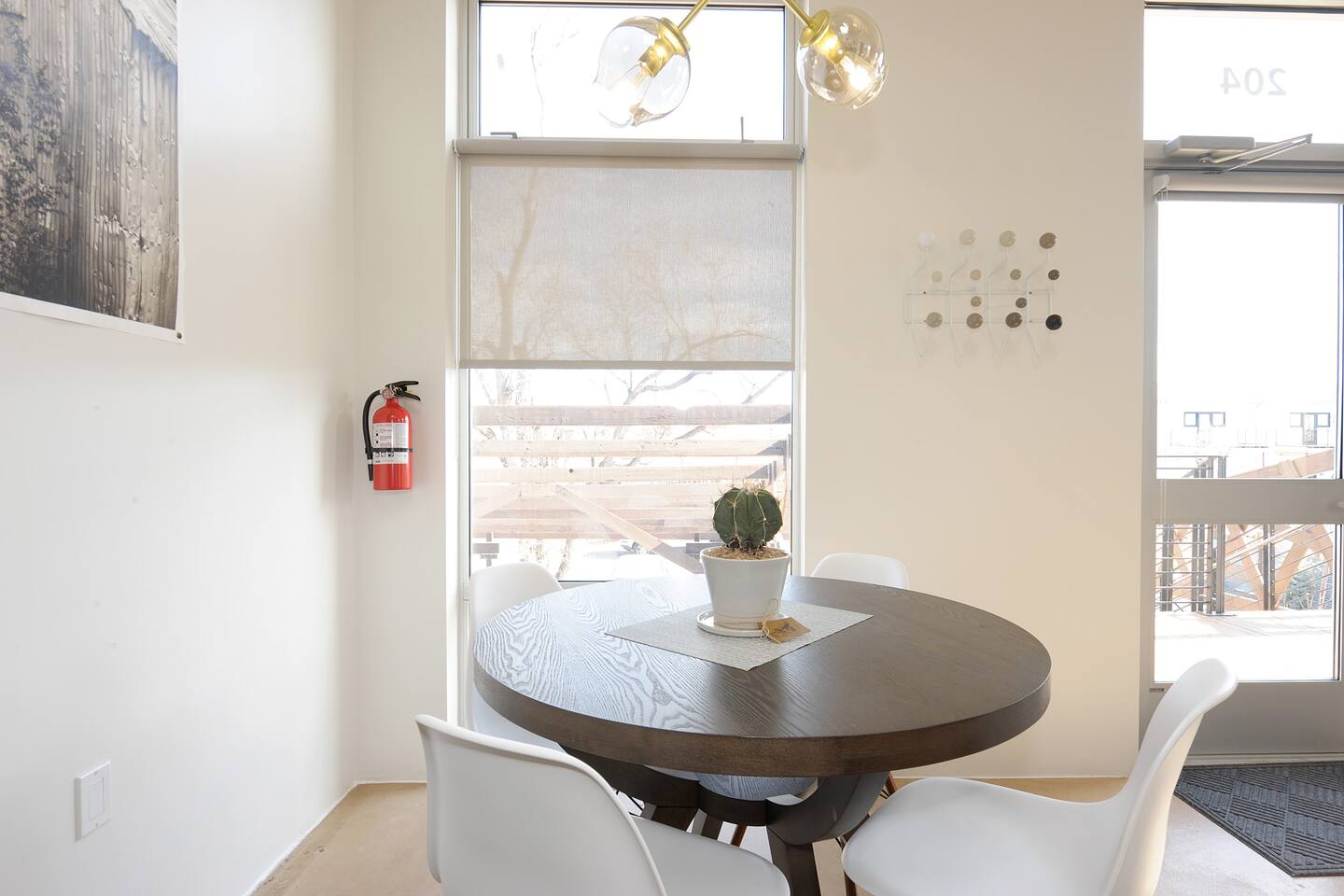 Experience Santa Fe living at its finest in this stylish, fully equipped, and modern 2nd-floor apartment located in the heart of the vibrant Baca Railyard. This light-filled space offers the perfect blend of comfort, convenience, and privacy, making it an ideal retreat for couples, solo travelers, or small families. Step inside and be greeted by a clean, contemporary design bathed in natural light. The apartment boasts a fully equipped cook's kitchen, ready for you to whip up anything from a quick breakfast to a gourmet meal. Enjoy the comfort of radiant floor heating in the cooler months and refreshing air conditioning during the warmer ones. Start your day with a cup of coffee on your private balcony, taking in the breathtaking mountain views. The super comfortable bed promises a restful night's sleep, and a bonus pull-out sofa provides additional sleeping space for guests. Stay connected with high-speed internet available throughout the apartment, perfect for working remotely. A dedicated dining area for four offers a versatile space for sharing meals, holding small meetings, or catching up on work. For entertainment, enjoy access to Netflix, Amazon Echo, and Spotify, all conveniently set up on the smart TV and Echo device. You'll have complete privacy during your stay, allowing you to relax and unwind at your leisure. Despite your privacy, the vibrant Baca Railyard offers a dynamic atmosphere just steps from your door. Our beloved "Cafecito" restaurant is just steps away, and you'll find yourself within easy reach of downtown, the historic Plaza, world-class museums, hospitals, and all of Santa Fe's extraordinary restaurants. For larger groups, an additional unit is available for rent below, providing flexible accommodation options. Whether you're exploring the city's rich history and culture, indulging in its culinary delights, or simply seeking a peaceful getaway, this Santa Fe apartment is the perfect home base for your adventure. A Tesla Destination Charger and 220 port are available for free EV Charging.